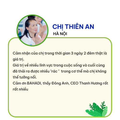 “Cảm nhận của chị trong thời gian 3 ngày 2 đêm thật là giá trị. Giá trị về nhiều lĩnh vực trong cuộc sống và cuối cùng đã thải ra được nhiều "rác " trong cơ thể mà chị không thể tưởng nổi. Cảm ơn BAHADI, thầy Đông Anh, CEO Thanh Hương rất rất nhiều” Chị Thiên An.