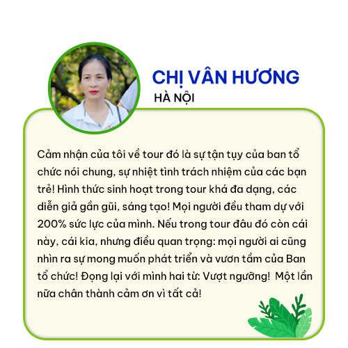 “Cảm nhận của tôi về tour đó là sự tận tụy của ban tổ chức nói chung, sự nhiệt tình trách nhiệm của các bạn trẻ! Hình thức sinh hoạt trong tour khá đa dạng, các diễn giả gần gũi, sáng tạo! Mọi người đều tham dự với 200% sức lực của mình. Nếu trong tour đâu đó còn cái này, cái kia, nhưng điều quan trọng: mọi người ai cũng nhìn ra sự mong muốn phát triển và vươn tầm của Ban tổ chức! Đọng lại với mình hai từ: Vượt ngưỡng! Một lần nữa chân thành cảm ơn vì tất cả “ . Chị Ngô Thị Vân Hương.